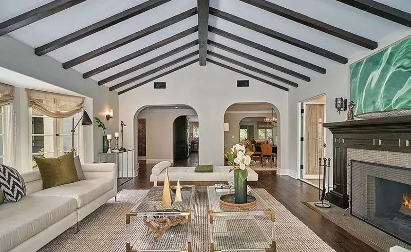 El salón es quizá la zona más importante de la casa de Pattinson, como parte de una habitación muy espaciosa con techos abovedados sostenidos por vigas de madera y una gran chimenea de ladrillo, además de los sillones blancos, claras alfombras y muebles a tono para completar la decoración.