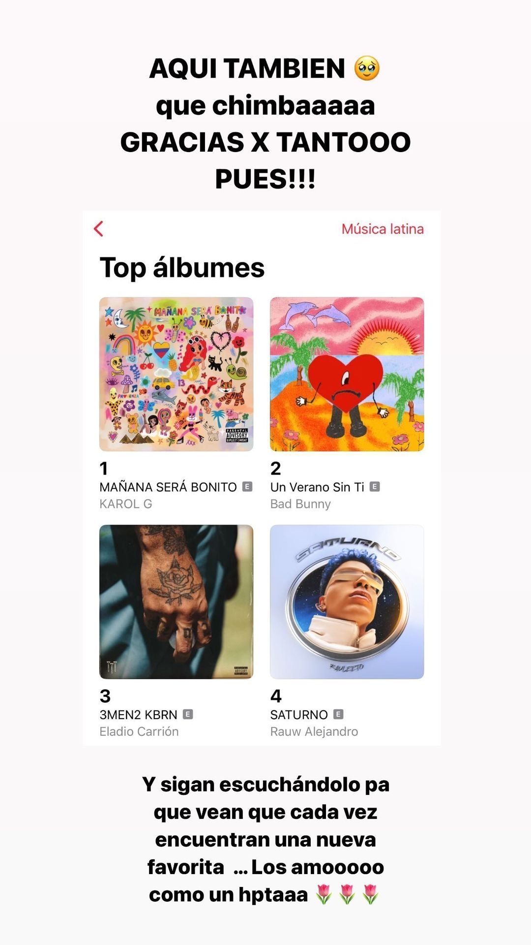 El otro estado también tiene que ver con impresionante éxito que está teniendo Karol G con su último trabajo discográfico. La foto consiste en un ranking de música latina que enseña al álbum de la talentosa colombiana como el más escuchado. "Aquí también que chimba, gracias por tanto pues y sigan escuchándolo pa que vean que cada vez encuentran una nueva favorita... los amo como un hptaaaa", fue lo que escribió la artista.
