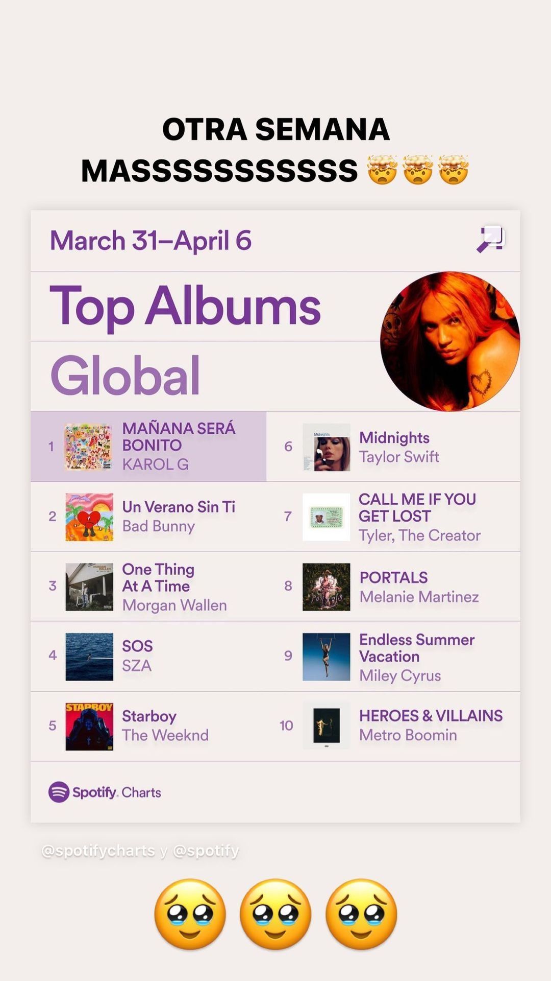 Mientras que en los otros estados de su cuenta oficial de Instagram, Karol G compartió una serie de buenas noticias junto a un mensaje que dice lo siguiente: "Otra semana más" es el comentario que agregó la nacida en Medellín junto al top de Spotify chart que posiciona a Mañana será bonito como el álbum más escuchado del mundo.