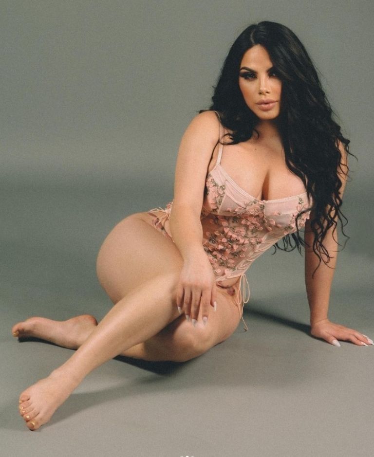 En las fotografías se la observa a la creadora de contenido posando en el piso y presumiendo de su espectacular figura con un conjunto de lencería transparente rosado pálido, con decorados de flores bordadas y cintas del mismo tono.