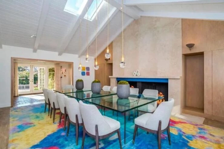 El comedor tiene una chimenea doble en una pared de piedra, también cuenta con una gran alfombra colorida sobre una larga mesa de vidrio con 12 asientos tapizados de color gris. Además, cuenta con una abertura en el techo y lámparas colgantes.