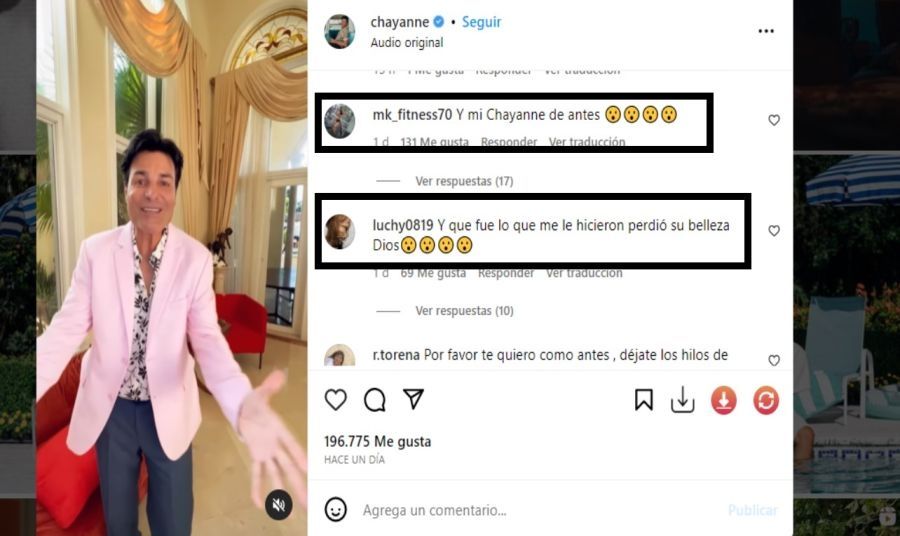 “Tiene una apariencia como rara”, “Estás muy flaco”, “Y mi Chayanne de antes”, “Eres Chayanne”, “Se habrá hecho algunos retoques estéticos”, “Qué te pasó” fueron algunos de los comentarios que recibió Chayanne en su posteo.