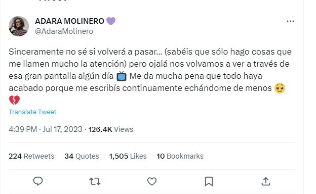 "Sinceramente, no sé si volverá a pasar… (sabéis que solo hago cosas que me llamen mucho la atención) pero ojalá nos volvamos a ver a través de esa gran pantalla algún día. Me da mucha pena que todo haya acabado porque me escribís continuamente echándome de menos", ha dejado claro en uno de sus comentarios en su cuenta de Twitter.