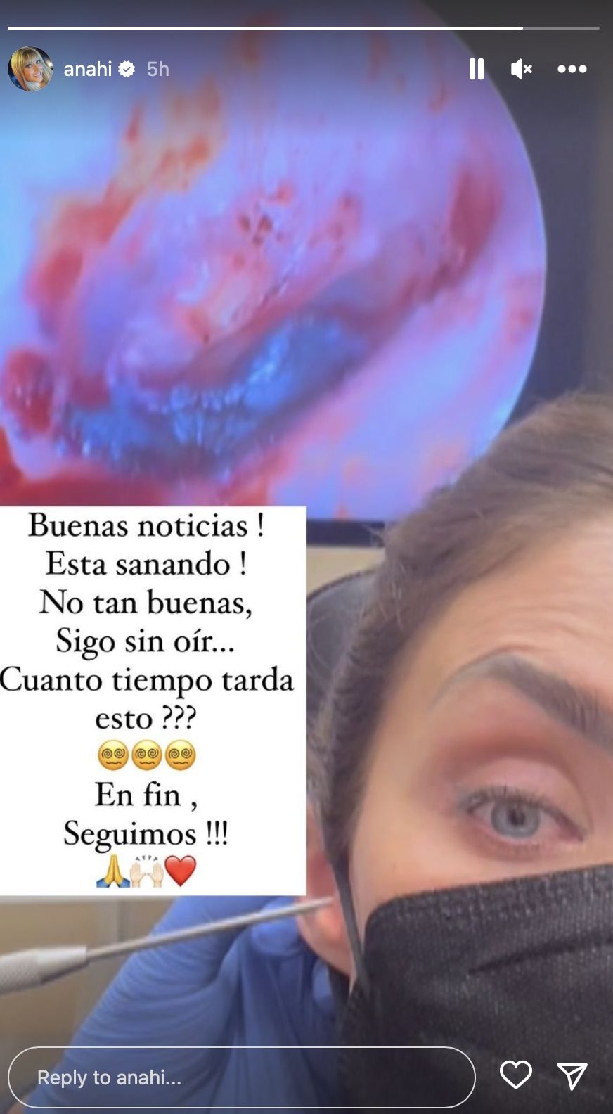 Luego de que hace unas semanas Anahí sufriera un serio percance en uno de sus oídos durante unos ensayos preparativos para la vuelta de "RBD", utilizó sus redes sociales para comunicarles a sus seguidores sobre su proceso de recuperación. "Buenas noticias, está sanando, no tan buenas, sigo sin oír. ¿Cuánto tiempo tarda esto? En fin, seguimos", escribió en una de sus historias de Instagram,