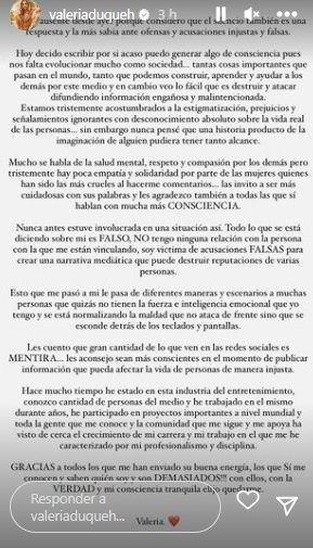 Asimismo, Valeria advirtió que el mal uso de las redes sociales puede afectar las vidas de las personas de manera injusta, y que eso está muy relacionado con la salud mental de los involucrados. "Mucho se habla de la salud mental, respeto y compasión por los demás, pero, tristemente, hay poca empatía y solidaridad por parte de las mujeres, quienes han sido las más crueles en hacerme comentarios, las invito a ser más cuidadosas con sus palabras", continuó el escrito de Duque.
