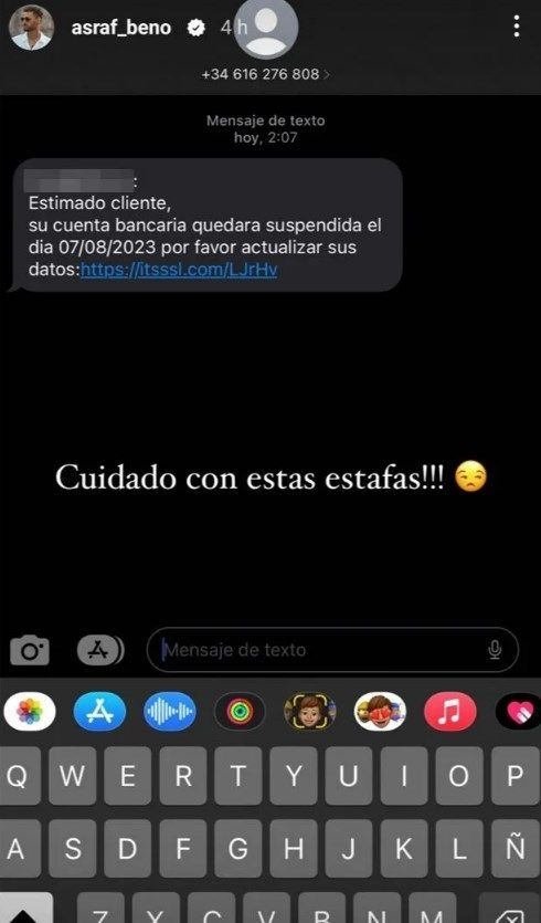 Asraf Beno vivió un buen susto en las últimas horas ya que estuvo a punto de caer en una conocida estafa si no fuera por su agudeza. El novio y futuro esposo de Isa Pantoja decidió alertar a sus seguidores a través de Instagram después de recibir un mensaje sospechoso en su teléfono móvil.
