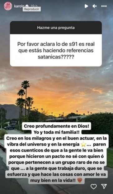 La Bichota echó por tierra estas versiones. “¡Creo profundamente en Dios! ¡Yo y toda mi familia! Creo en los milagros y en el buen actuar, en la vibra del universo y en la energía”, comenzó explicándole a uno de sus fanáticos.