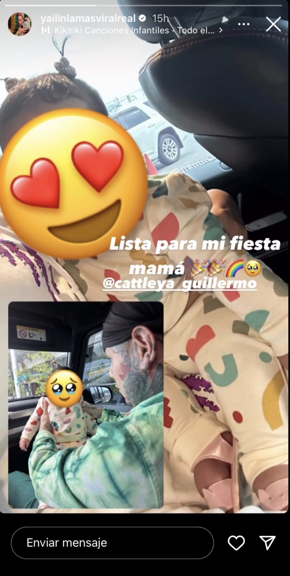 Como suele hacer Yailin con cada foto de Cattleya que comparte, le cubrió el rostro a la pequeña con emojis de carita con corazones y carita con los ojos llorosos. Si bien en la historia se aclara que la niña va camino a su primera fiesta, la dominicana no dio mayores detalles del lugar a donde se trasladaban la cantante, la pequeña y Tekashi69.