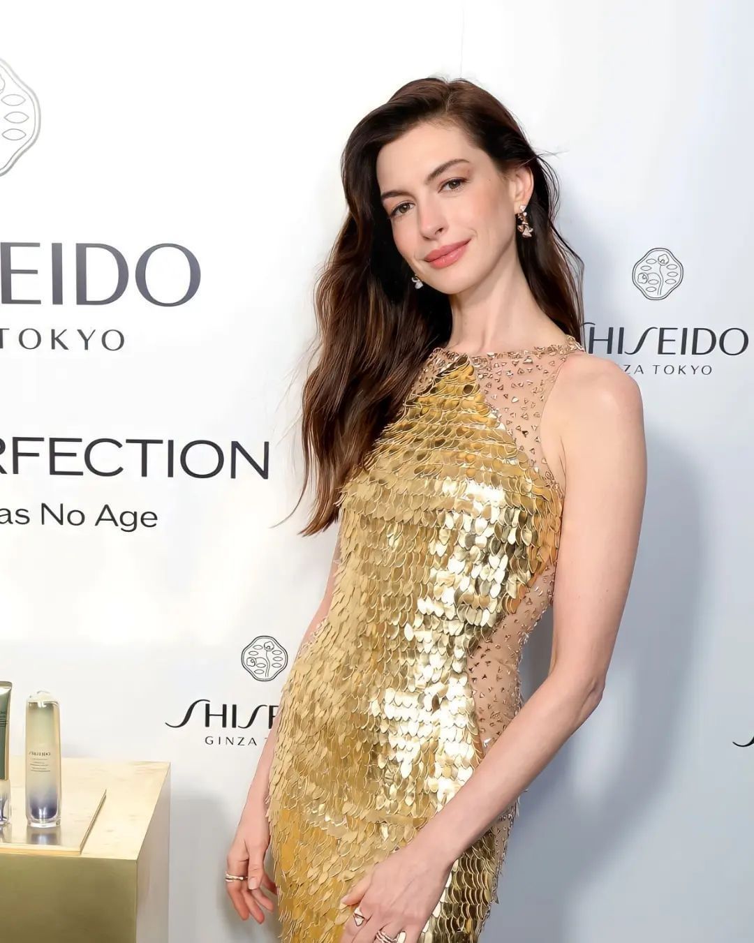 Anne Hathaway se convirtió en la embajadora de la marca Shiseido. En el evento celebrado en Nueva York para darle la bienvenida, la actriz se robó todos los suspiros con un espectacular vestido dorado ajustado al cuerpo con escote triangular y cuello traslúcido.