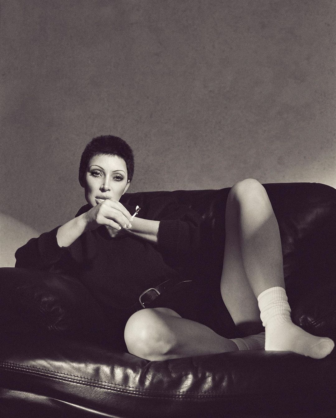 La famosa no solo sorprende con su corte de pelo y maquillaje, sino también con su elección de atuendos. En una de las fotos, lleva una camiseta tipo esqueleto y unas mallas cortadas a modo de shorts, que combina con un enorme suéter y una falda estilo tutú. La elección de estas prendas refuerza la idea de una imagen andrógina y desenfadada.