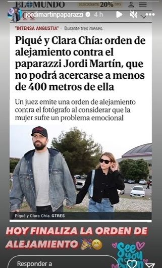 Por medio de una historia en su cuenta Instagram, Jordi anunció a sus seguidores el final de la medida que le habían impuesto. "Hoy finaliza la orden de alejamiento. Nos vemos pronto", escribió acompañando una imagen de una tapa de un periódico donde aparecen Piqué y Chía Martí.