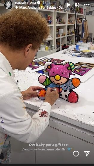 Por su parte, el hijo de Marc Anthony y Nadia Ferreira también recibió un regalito de parte del artista plástico. "Nuestro pequeño también recibió un presente de su tío, Romero Britto", escribió la modelo paraguaya junto a una foto donde el pintor está dando sus últimos retoques a un osito creado exclusivamente para el hijo de los famosos.