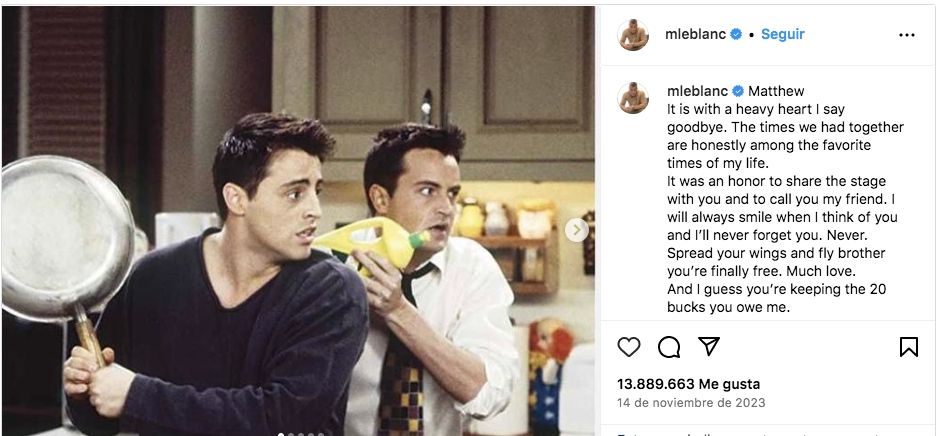 Matt publicó un sentido mensaje en sus redes sociales para quien había sido un amigo en su carrera, mostrando su cara luego de mucho tiempo. “Matthew. Me despido con gran pesar. Los momentos que pasamos juntos se encuentran, honestamente, entre los momentos favoritos de mi vida”, escribió en su cuenta de Instagram.