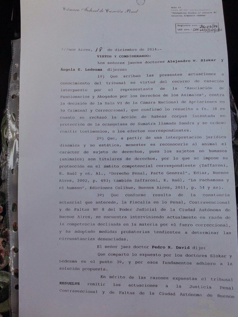 - Sí. Un fallo con estas características, con esta definición, profundidad, con la categoría y jerarquía del tribunal, que es la Cámara Federal de Casación Penal, el máximo intérprete del derecho penal en la Argentina antes de que intervenga la Corte Suprema de Justicia, es un hecho inédito a nivel mundial otorgar el derecho, en este caso a Sandra, la categoría de ser "sujeto de derecho", "sujeto no humano", con un derecho a la libertad y a no sufrir los daños del cautiverio, es un fallo trascendente. No solamente repercute positivamente en el caso de Sandra, sino que que se proyecta a otros casos, que ya se han promovido o que se van a promover, a una discusión sobre la legislación vigente que considera a los animales objetos y no sujetos de derecho, y también a una discusión filosófica profunda sobre la ontología del ser, sobre qué es la humanidad y sobre cuál es la extensión de la humanidad, en términos de lo que los tratados recogen sobre ésto, y para hacer posible una buena vida a toda la humanidad.