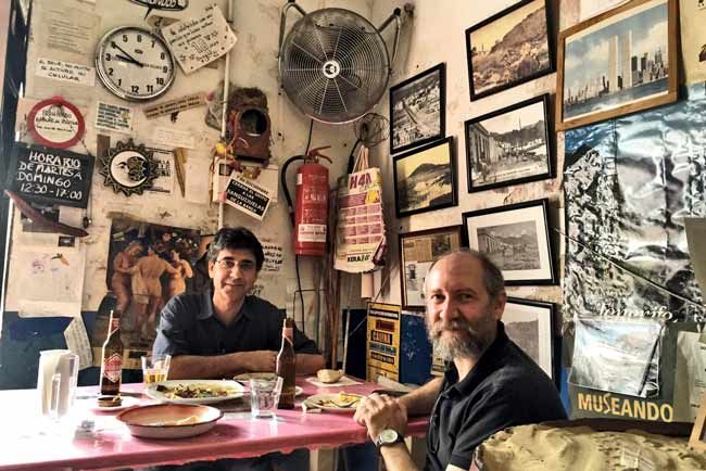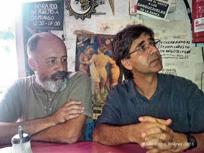 Le propuse una entrevista estando en Tenerife y accedió, así que aproveché para pedir consejo a Tito Expósito, editor de Baile del Sol, para buscar un sitio de allí, algún local tradicional y, mira por donde, acabamos en el espacio revolucionario de Nelson, donde de lo local surge un espacio internacional. Y rodeados de un ambiente cargado de mensajes, nos refrescamos del bochorno con ventilador y cerveza, entre carteles, dibujos, panfletos, alguna bandera republicana y una tortuga con pancarta (“vamos despacio porque vamos lejos”), tuvimos esta enésima charla durante esas jornadas, pero ahora con una grabadora al lado. No me he atrevido a cortarle nada, porque nada tiene desperdicio, pero animo también a leerle en sus libros porque será otra forma de ver a Jorge Majfud.
