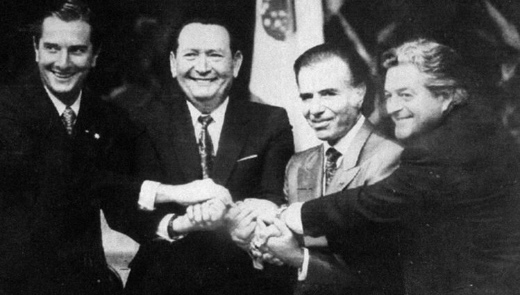 Collor de Mello (Brasil), Rodríguez (Paraguay), Menem y Lacalle, en 1991, en la firma del tratado de creación del Mercosur, en Asunción.