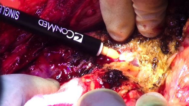 Usando un lápiz electroquirúrgico, Perera necesita separar cuidadosamente el hígado de Connie del tejido circundante en su abdomen.