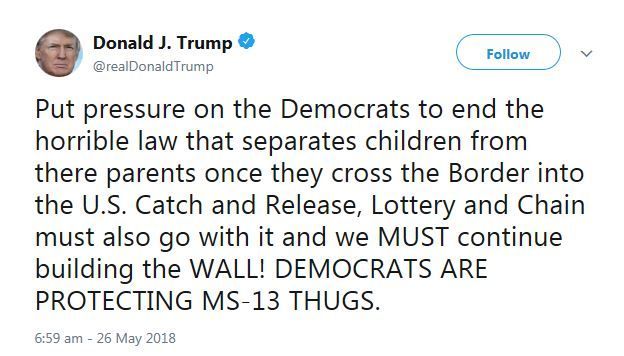 En mayo, Trump abogaba por "presionar a los demócratas a poner fin a esta ley horrible que separa a los niños de sus padres una vez que cruzan la frontera de Estados Unidos".
