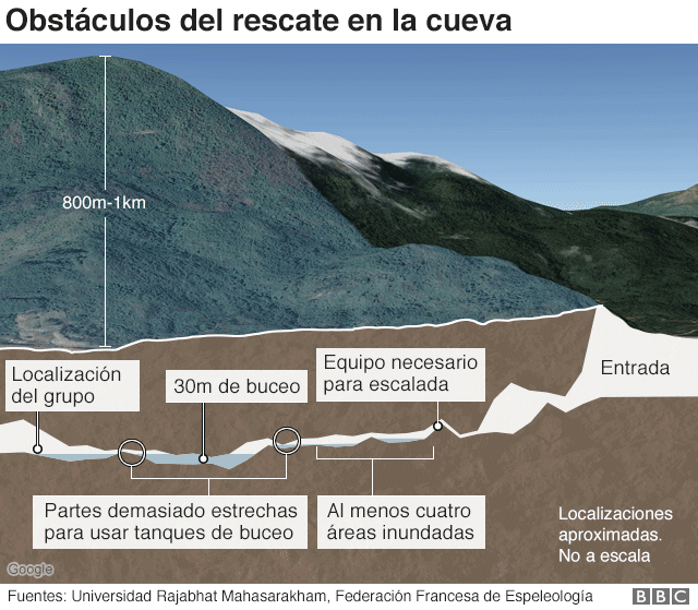 El británico Bill Whitehouse, del Consejo de Rescate, dijo a la BBC que tuvieron que navegar "por pasajes que estaban en parte inundados", lo que hacía imposible salir sin el equipo adecuado.