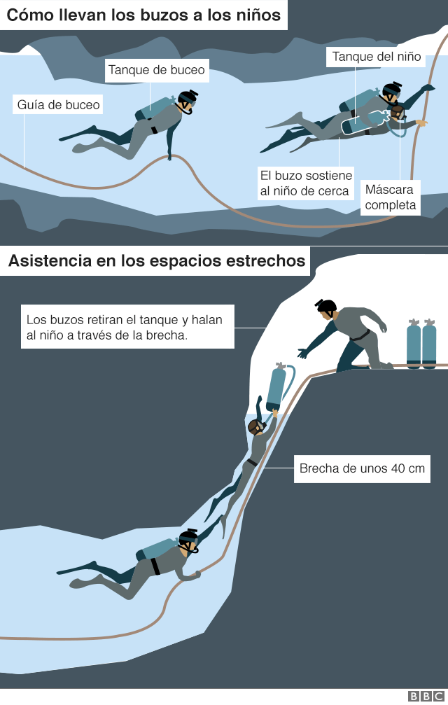 Dos buzos acompañarán a cada niño durante toda la operación y han sido guiados por una cuerda desplegada por los rescatistas.