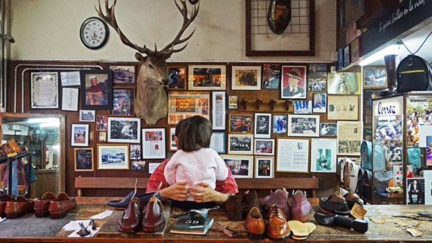 Aunque el local -decorado con un venado disecado y fotos de antaño- es pequeño, detrás están los enormes y oscuros cuartos donde 14 empleados cosen, confeccionan y cortan los materiales de los zapatos.
