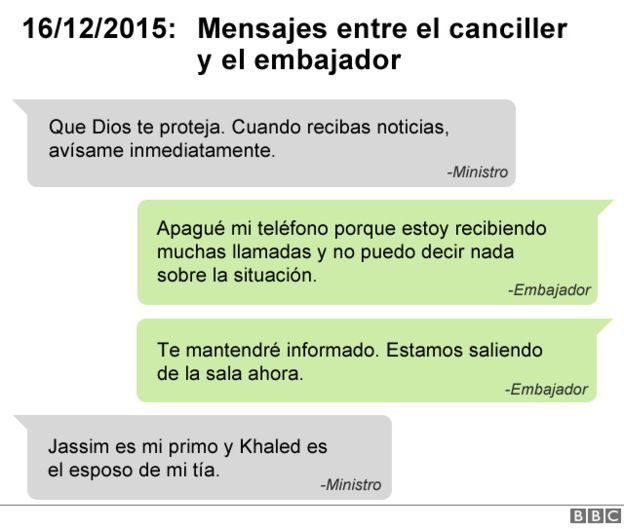 "Jassim es mi primo y Khaled es el esposo de mi tía", escribió en un mensaje de texto al embajador de Qatar en Irak, Zayer al Khayareen.