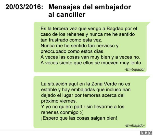 El embajador volvió a enviar otro texto diciendo que el general iraní estaba "muy molesto" con los secuestradores. "Quieren cansarnos y forzarnos a aceptar sus demandas inmediatamente. Necesitamos permanecer calmados y no apurarnos".