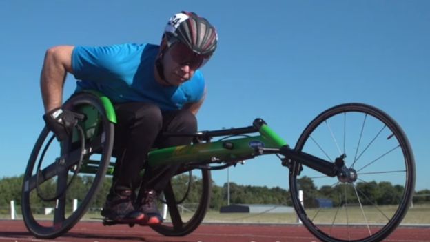 Martin Pistorious ahora participa en carreras en silla de ruedas.
