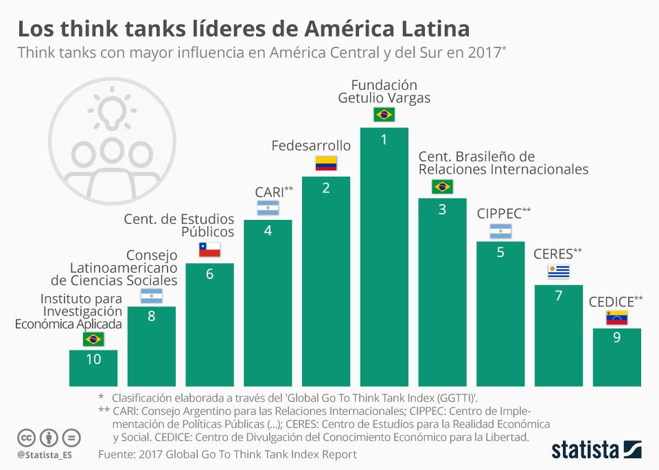 El liderazgo en la región lo detenta la poderosa Fundación Getulio Vargas, de Brasil, secundada por la colombiana Fedesarrollo y el Centro Brasileño de Relaciones Internacionales.