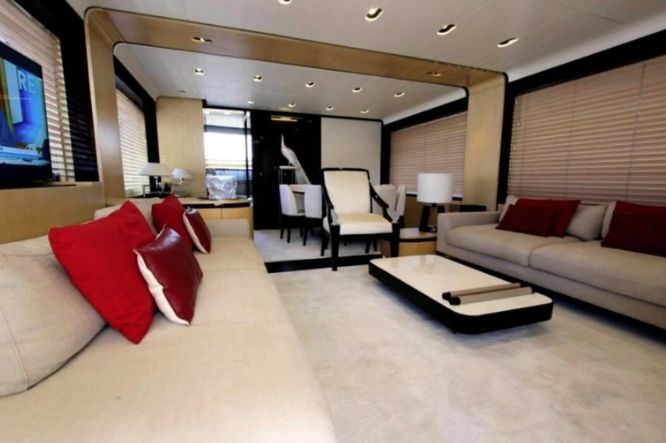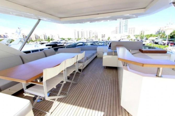 En la proa, existe un espacio cubierto con almohadones para poder disfrutar del sol, como así también un jacuzzi y una enorme terraza que descansa en la cubierta con mesa para los comensales y otro sofá para recostarse.