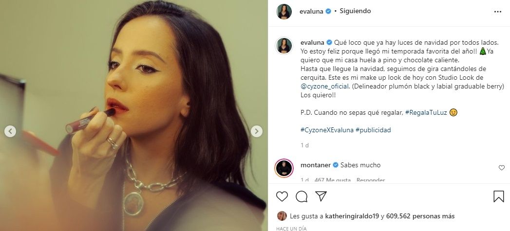 "Qué loco que ya hay luces de navidad por todos lados. Yo estoy feliz porque llegó mi temporada favorita del año!! ??Ya quiero que mi casa huela a pino y chocolate caliente. Hasta que llegue la navidad, seguimos de gira cantándoles de cerquita. Este es mi make up look de hoy con Studio Look de @cyzone_oficial. (Delineador plumón black y labial graduable berry) Los quiero!! P.D. Cuando no sepas qué regalar, #RegalaTuLuz ??".
