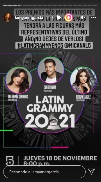 “Los premios más importantes de la música de habla hispana tendrán a las figuras más representativas del último año ¡No dejes de verlos! #LATINGRAMMYENC5” fue el promocional texto que eligió Yanet para acompañar un flyer oficial de la ceremonia de premiación. En las mismas se podrían ver a los presentadores del evento: Carlos Rivera, Ana Brenda Contreras y Roselyn Sánchez.