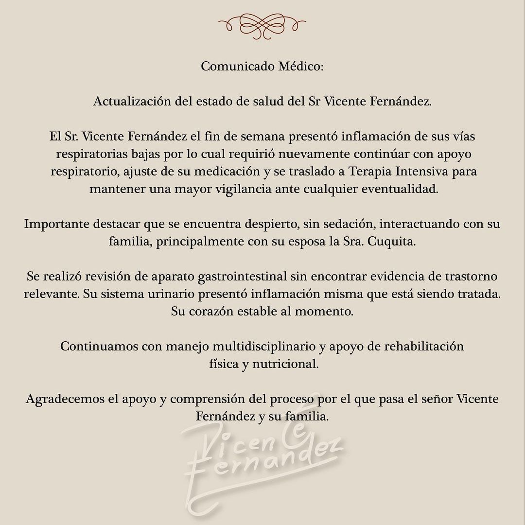 relevante. Su sistema urinario presentó inflamación misma que está siendo tratada. Su corazón estable al momento. Continuamos con manejo multidisciplinario y apoyo de rehabilitación física y nutricional. Agradecemos el apoyo y comprensión del proceso por el que pasa el señor Vicente Fernández y su familia".