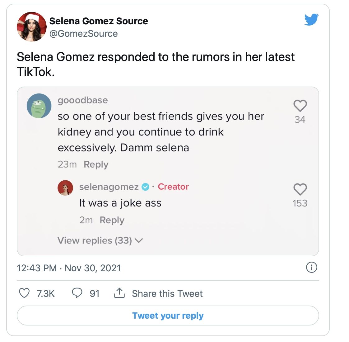 Por último, la intérprete especificó que se trataba de un broma por lo que comentó: ‘es un chiste’, pero esto no fue tomado como tal por algunos de sus fanáticos que respondieron a este mensaje diciendo: "Así que una de tus mejores amigas te da su riñón y tú continúas bebiendo excesivamente". Lo que Selena Gomez decidió responder: ‘era un chiste’ junto con un insulto.