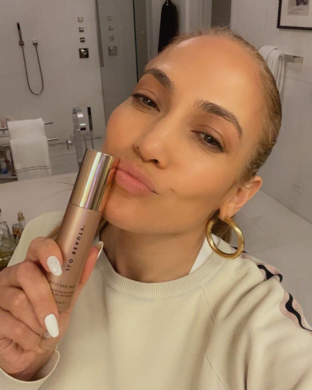 Por otra parte, en otra de las publicaciones de la mencionada página se puede ver cómo promociona uno de sus productos para tener un brillo especial en su piel y lucir como lo hace ella. El mismo tiene como nombre "That star filter". En tanto que acompañando a dicho producto, la empresa escribió en parte lo siguiente: "One of @JLo’s secrets to achieving a luminous glow is THAT STAR FILTER" (Uno de los secretos de JLo para lograr un brillo luminoso es ESE FILTRO DE ESTRELLA).