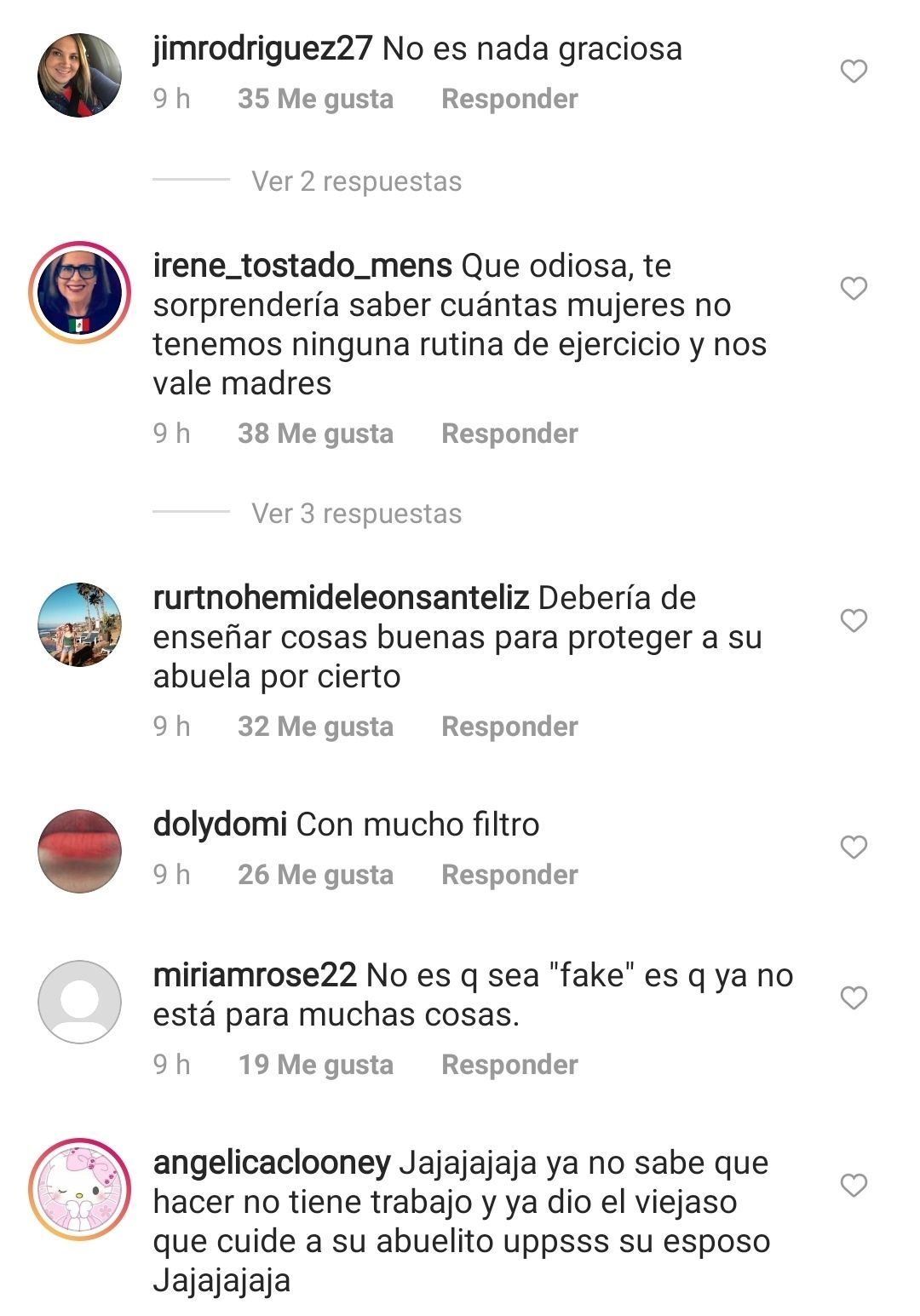 Thalía lo hizo a su manera, en un tono bromista y en primera plana dijo: “Esta mujer toda 'fake', se sacó las costillas para tener ese cuerpazo. Enséñame tu rutina de ejercicios, enseñamela, estar sentadota en el sillón o tiradota en la cama, enséñame tu rutina de ejercicios”. De fondo una música dramática acompañó el mensaje que iba dirigido directamente a los “haters”.