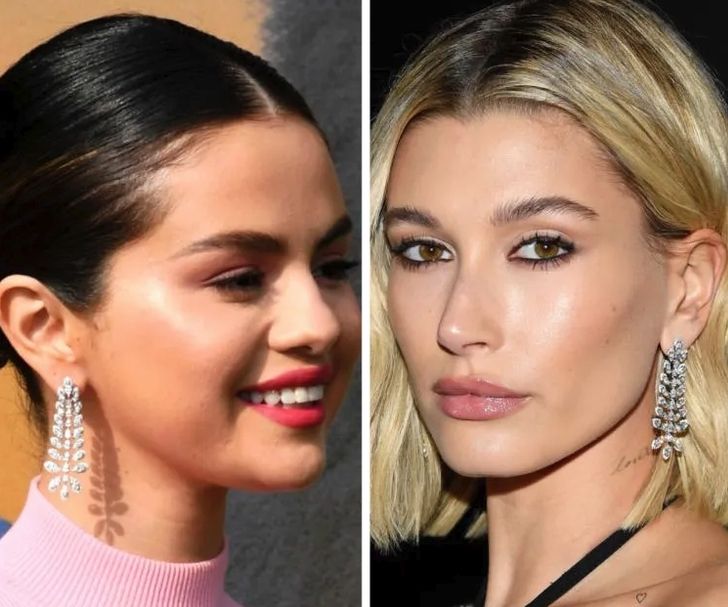 4. Más acá en el tiempo, Selena usó unos hermosos aretes durante el estreno de la película "Dolittle" en enero del año pasado, y un mes después, Hailey lució los mismos, nuevamente, en la semana de la moda en París.