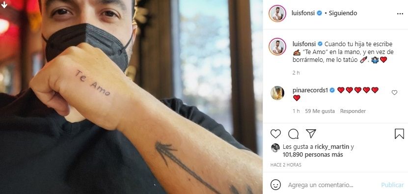 Es que hace algunas horas atrás, el famoso puertorriqueño, compartió en su cuenta de Instagram una foto de él donde enseñó su nuevo tatuaje, el significado que tiene y el motivo del por qué se lo grabó en su piel. Por su parte en la descripción de la misma, Fonsi escribió: "Cuando tu hija te escribe ✍ “Te Amo” en la mano, y en vez de borrármelo, me lo tatúo . ♂️❤️".