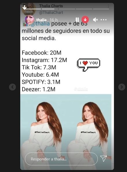 Además, por otra parte, en uno de sus estados de la red social mencionada anteriormente, Thalía compartió unos datos que afirman que actualmente posee 65 millones de fanáticos en todas partes del mundo. Esta cifra es el total de todos los fanáticos que tiene la azteca en las diversas redes sociales.