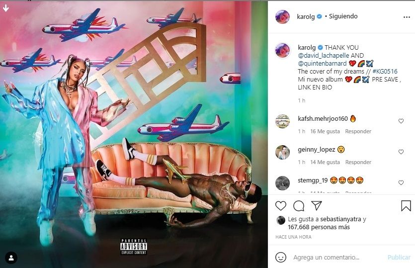 La colombiana Karol G compartió, hace unos minutos atrás, la tapa de su tercer disco de estudio y es tendencia en varios portales de noticias del espectáculo por la imagen que aparece en la misma. Según comentó ella en al descripción del mencionado posteo este trabajo discográfico se llama KG0516. De este álbum se desprende su canción lanzada recientemente llamada "Location".