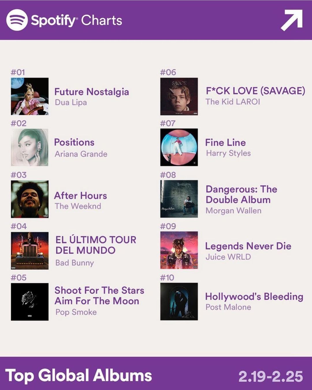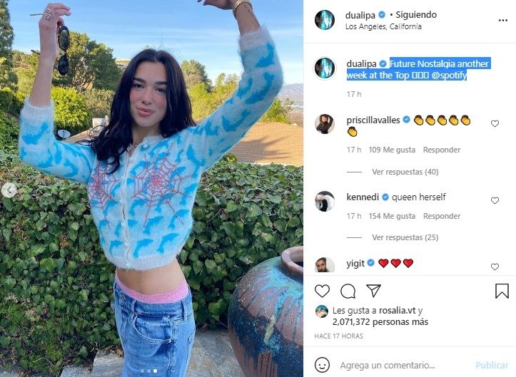 En primer lugar recordemos que la intérprete la canción "Don't Start Now" fue noticia en España, hace días atrás, al llegar por primera vez en el país europeo al puesto número uno con Future Nostalgia. Recordemos que el mismo fue disco de oro en 2020 al contener canciones de las más escuchadas en todo el planeta.