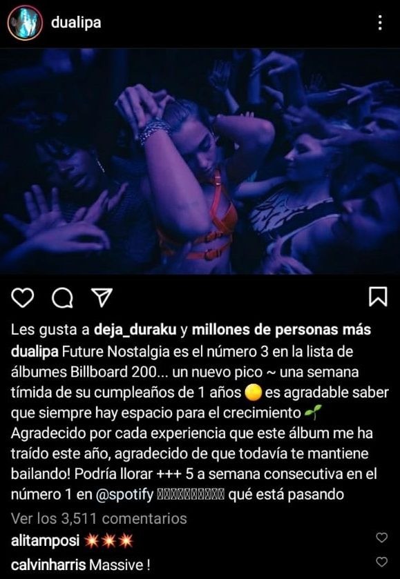 Dua Lipa hace algunas horas atrás compartió en su perfil de Instagram una fotografía con las hazañas mencionadas anteriormente. Sobre ello la talentosa cantante escribió un mensaje que dice lo siguiente: "Future Nostalgia es el número 3 en la lista de álbumes Billboard 200... un nuevo pico, una semana tímida de su cumpleaños de 1 año. Es agradable saber que siempre hay espacio para el crecimiento. Agradecida por cada experiencia que este álbum me traído este año, agradecida de que todavía te mantiene bailando! Podría llorar por 5 semana consecutiva en el número 1 de Spotify, que está pasando".