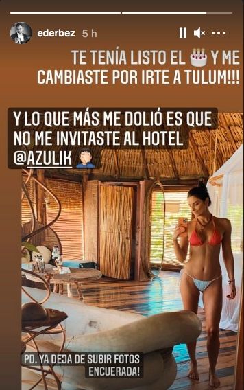 Como si fuese poco, a esta publicación sumó una segunda historia en la cual puso “te tenía listo el pastel y tú me cambiaste por Tulum. Y lo que más me dolió es que no me invitaste al hotel Azulik”.
