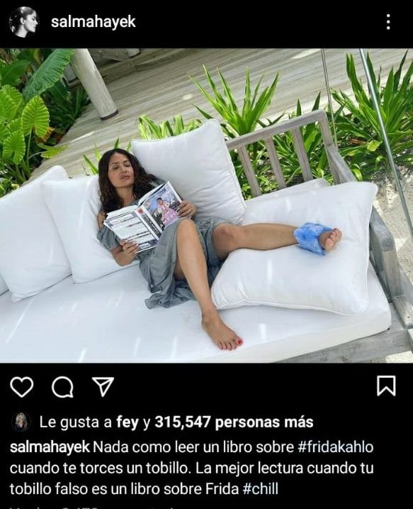 Además, a dicha imagen, la bellísima Salma Hayek agregó el siguiente mensaje: "Nada como leer un libro sobre #FridaKahlo cuando te tuerces un tobillo. La mejor lectura cuando tu tobillo falso es un libro sobre Frida #Chill" (textual). Esto se debe a que diariamente la bella morena se somete a una extensa rutina de ejercicios para mantener su tonificada figura.