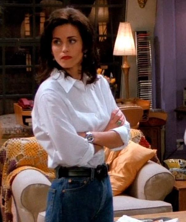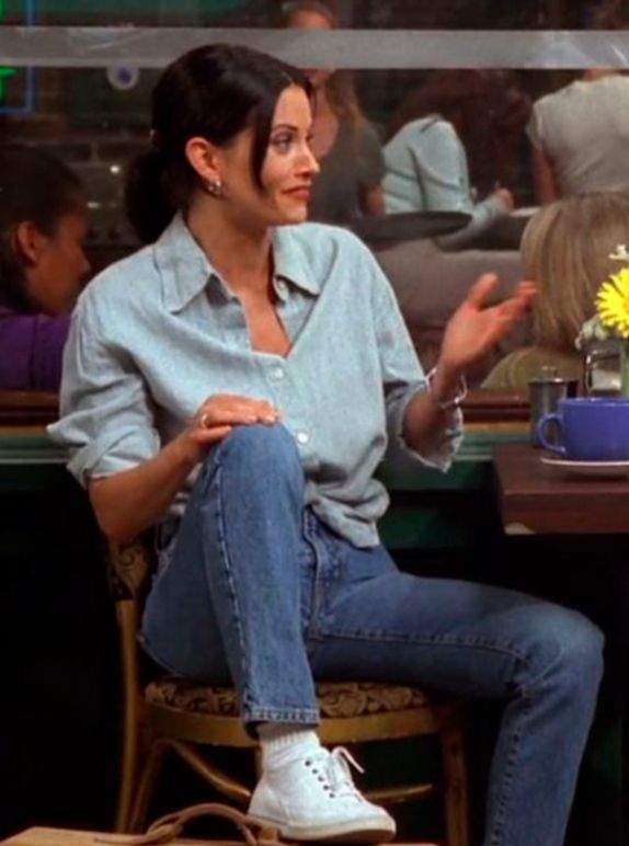 Monica es la más clásica de las tres amigas y priorizó siempre la comodidad: un buen jean y remeras o camisas. Estilo clásico y simple sigue siendo tendencia hasta hoy y nunca pasará de moda.