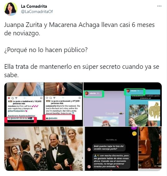 La creadora de contenido “La Comadrita” publicó en su cuenta de Twitter una serie de imágenes que demostrarían la relación entre Juanpa Zurita y Macarena Achaga. El youtuber mexicano da vida al papel de Alejandro Basteri, hermano de Luis Miguel; en tanto la modelo argentina interpreta a Michelle Salas, hija del ídolo azteca. Ambos quedaron flechados desde un primer momento que comenzó el rodaje de esta nueva temporada.