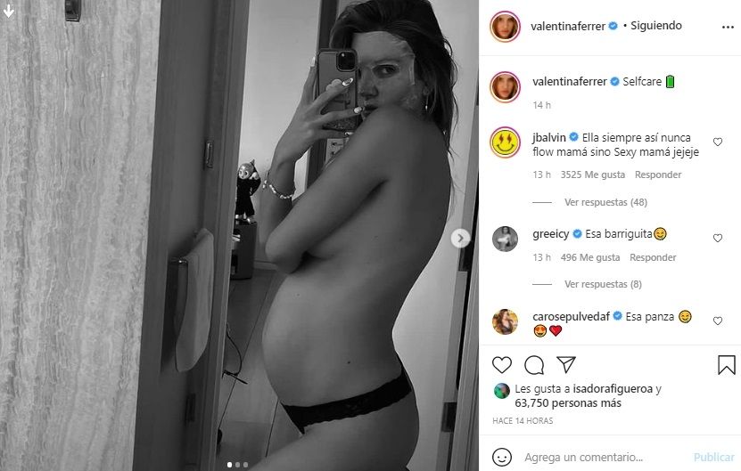 En tanto que como mencionamos al comienzo de la nota la talentosa argentina publicó en su feed de Instagram una serie de fotos de ella donde se la puede ver posando con su panza de embarazada frente al espejo. Mientras a dicho posteo J Balvin comentó lo siguiente: "Ella siempre así nunca flow mamá sino Sexy mamá jejeje".