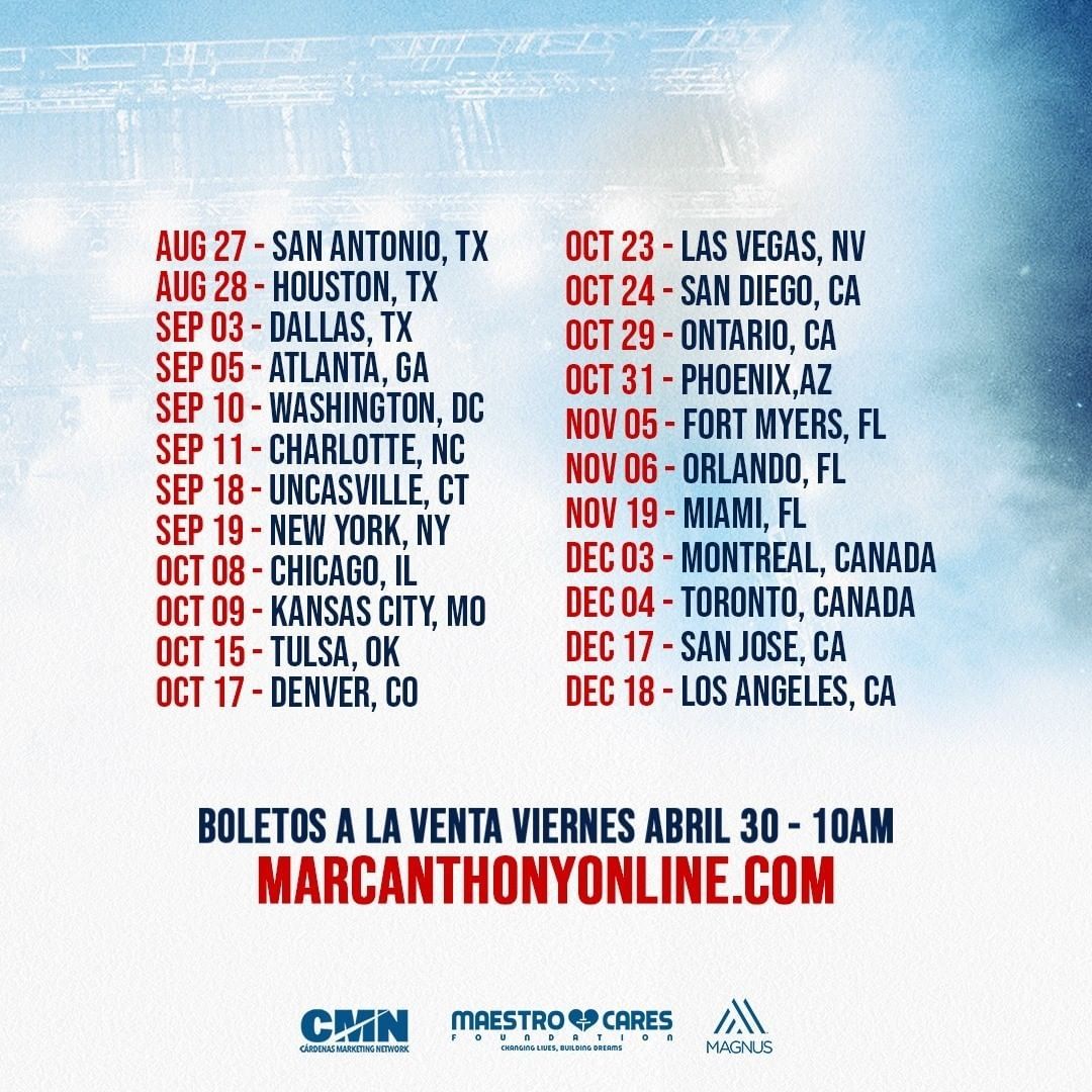 Esta gran gira comenzará, si la pandemia lo permite, el próximo 27 de agosto en la ciudad de San Antonio, Texas y finalizará el 18 de diciembre en Los Angeles, California. En total es talentoso cantante, realizará 23 presentaciones que sin dudas serán una mejor que la otra. Por su parte Marc junto al comunicado escribió: "¡Estoy feliz de volver a los escenarios este 2021 y quiero que lo vivamos juntos! #MarcAnthonyTour21 No te lo pierdas!"