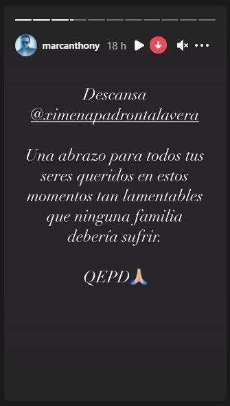 Allí con videos y mensajes Marc Anthony se despidió de Ximena Padrón Talavera. En una de las placas que publicó el intérprete de la canción "Flor negra" se puede leer lo siguiente: "Las palabras no bastan para expresar el dolor de perder un alma tan joven y prometedora". Mientras que en otra de ellas, el ex esposo de Jennifer Lopez escribió: "Descansa en paz Ximena Padrón Talavera. Un abrazo para todos tus seres queridos en estos momentos tan lamentables que ninguna familia debería sufrir. QEPD".