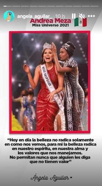 Recién coronada como Miss Universo 2021, la mexicana Andrea Meza recibió una cálida felicitación de parte de la también mexicana Ángela Aguilar.